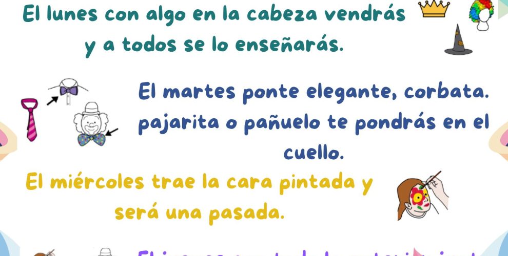 Semana de Carnaval en el cole. La celebración incluye las consignas para cada día y el viernes chocolate con churros para todo el alumnado.